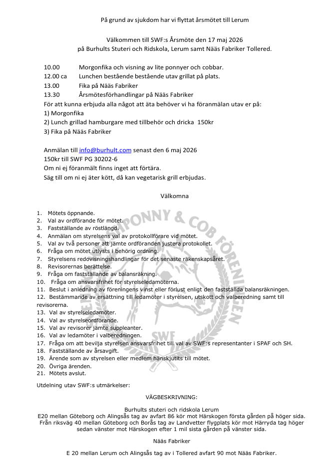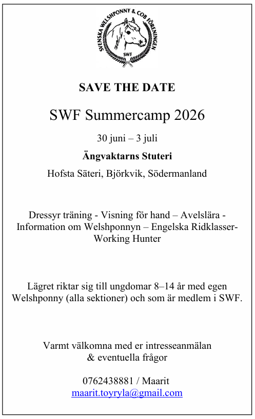 En anonym anmälan på SWF har inkommit till länsstyrelsen där anmälaren kräver stopp av registreringar av Wpb. Länsstyrelsen har nu beslutat att SWF inte får registrera dessa förrän Jordbruksverket har godkänt den nya Avelsplanen för Welsh Partbred. Så tillsvidare avvakta med att skicka in era fölpassansökningar på Wpb och vi meddelar så fort vi hör förändringar. Vill ni ha mer information kontakta Gunn Johansson 0708133277